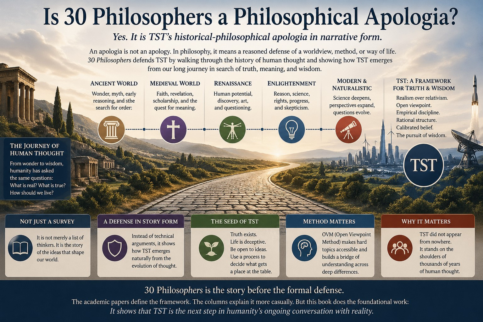 So, 30 Philosophers is not merely a survey of famous thinkers. It is the first broad defense of the TST worldview. It defends realism over relativism. It defends open viewpoint over tribal certainty. It defends empirical discipline, rational structure, calibrated belief, and the pursuit of wisdom. It tells the story of how humanity built the tools TST now gathers into one framework.