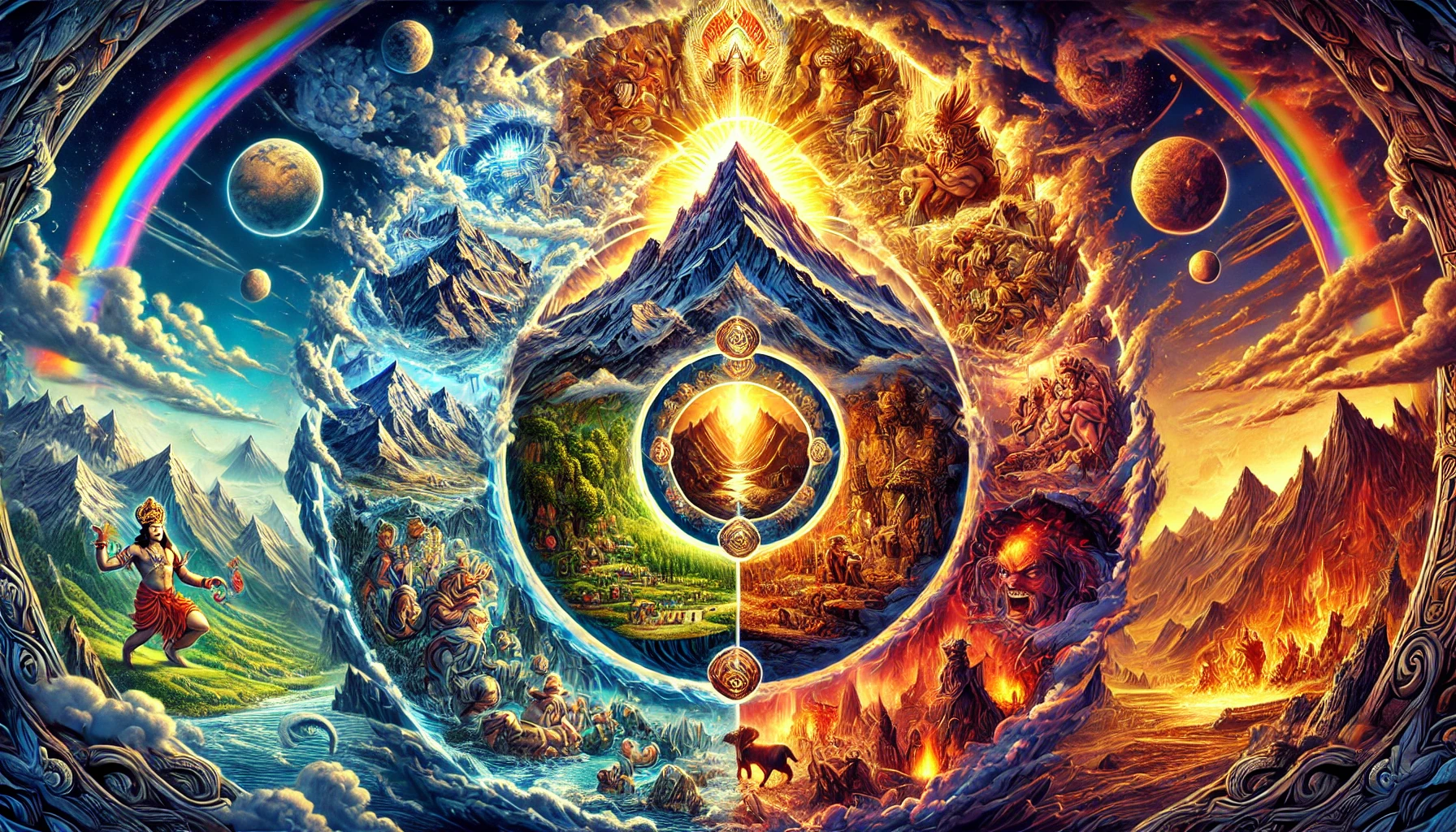 First, the history. In ancient India, Mount Meru was widely understood as the cosmic mountain at the center of the universe, with heavens above and lower realms below. Around this worldview were the six realms of existence: gods, humans, animals, hungry ghosts, hell beings, and other states of rebirth. These ideas shaped much of ancient Indian thought and influenced traditions such as Hinduism, Jainism, Buddhism, and later Sikhism. Even today, some believers take these realms literally, while others treat them more symbolically, as moral and psychological maps of human experience.