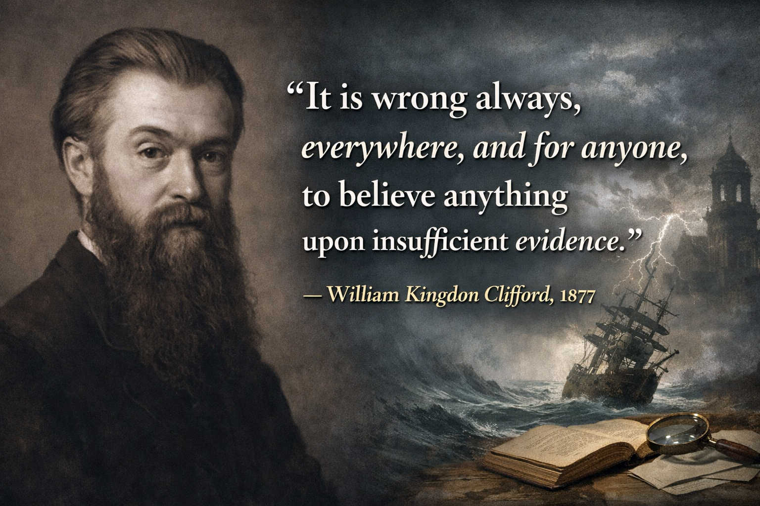 William Kingdon Clifford was a British mathematician and philosopher who lived from 1845 to 1879. He died young, at just 33, but left a lasting mark in both mathematics and philosophy. He worked on geometry and the nature of space, and Britannica notes that some of his ideas about matter and spatial curvature foreshadowed later themes in Einstein’s general relativity. So Clifford was not a minor scold wagging his finger at belief. He was a serious mind, cut short early, whose thinking reached across science, mathematics, and philosophy.