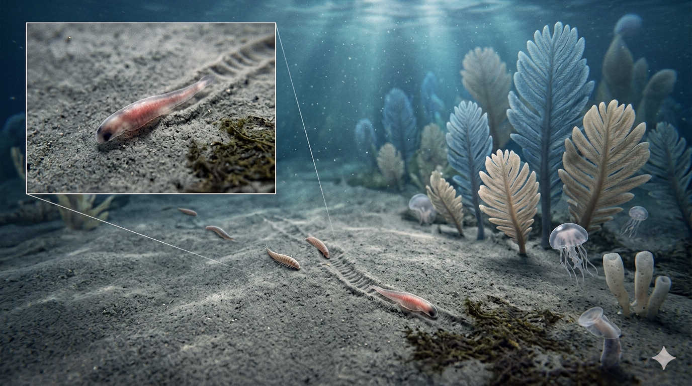 The Ur-Bilaterian is the common ancestor of almost all complex animals alive today, from the tiniest tardigrade to the human being. In 2020, scientists identified a tiny, worm-like fossil in Australia named Ikaria wariootia that fits this description perfectly. About the size of a grain of rice, it lacked legs or eyes but possessed the fundamental bilateral blueprint: it could burrow through the seafloor with intent, using muscles to move toward organic matter. It represents the “Source Code” for every creature that possesses a head and a tail.