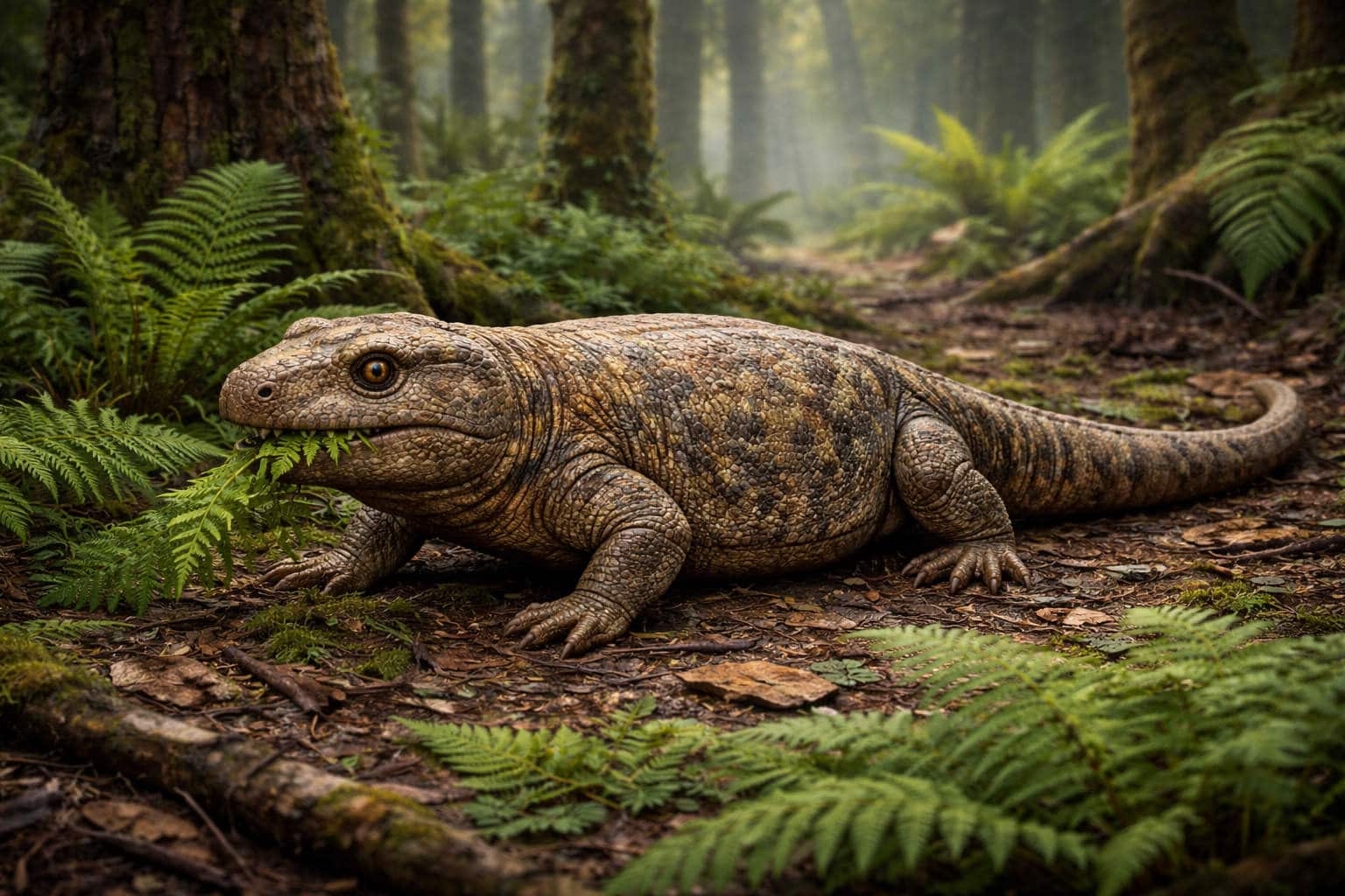 An early reptile known as a microsaur, an amniote relative. A small, stocky stem-amniote tetrapod discovered in Nova Scotia, Canada. Its skull shows dental adaptations for processing tough plant material — large cheek musculature, grinding teeth, and a downturned snout suited for cropping low vegetation. While it probably also consumed insects and small prey, the dental morphology suggests this species was among the earliest vertebrates experimenting with significant plant consumption. This pushes the onset of terrestrial herbivory deeper into the Late Carboniferous than previously assumed and highlights that plant-eating was already part of some tetrapod diets before classic large herbivores like Diadectes and synapsids diversified.