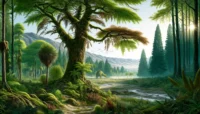 Imagined image of Orrorin tugenensis in a natural landscape, approximately 6 million years ago. The scene captures this early human ancestor walking upright, showcasing its bipedal nature in a lush, prehistoric African forest setting.
