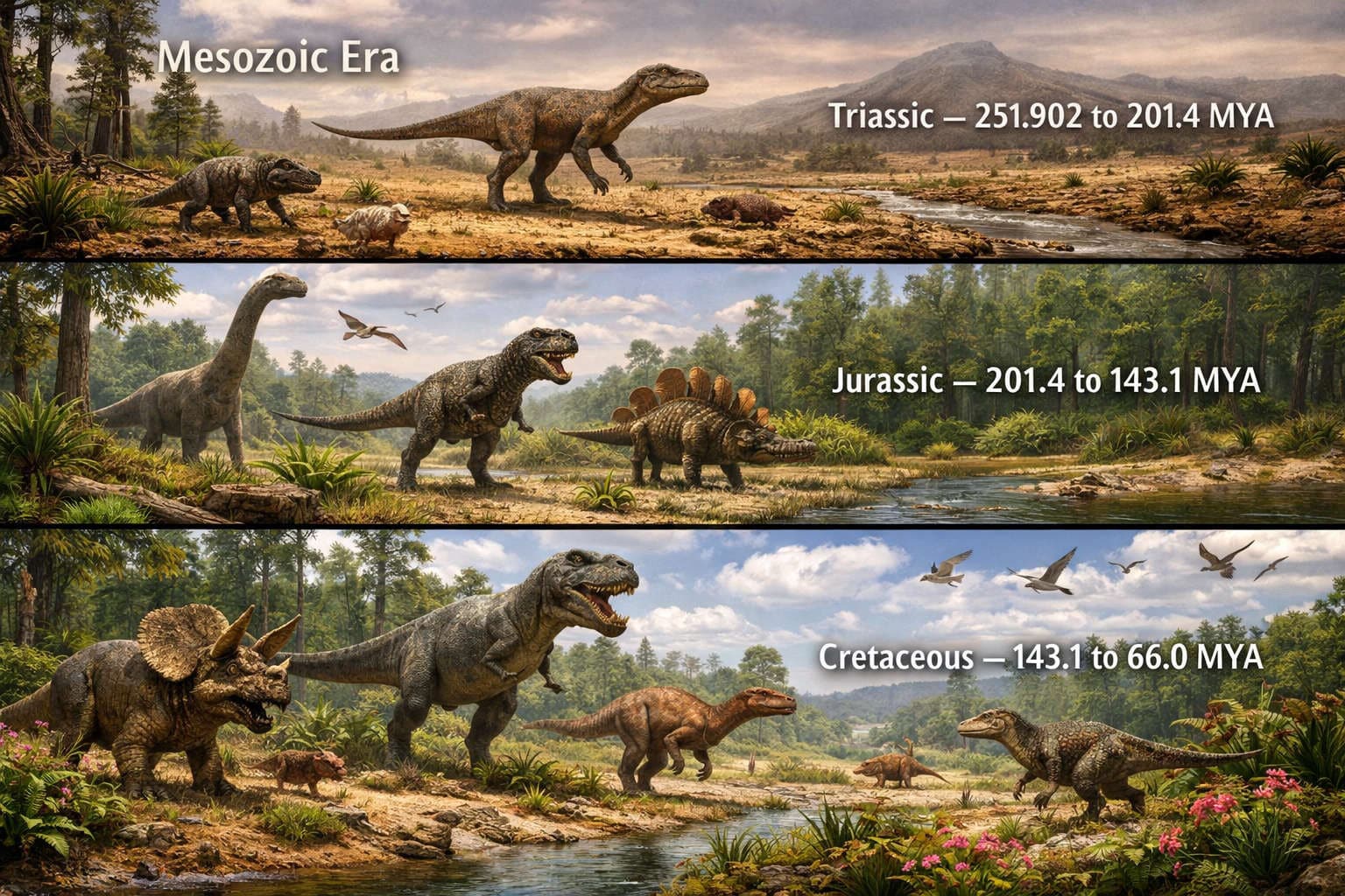 To frame its roughly 186 million years, it helps to think of the Mesozoic in three grand acts. First comes the Triassic, a recovery world in which ecosystems were still rebuilding and the earliest dinosaurs appeared. Then comes the Jurassic, when dinosaurs expanded into many of their most famous forms and Pangaea began to break apart more clearly. Finally comes the Cretaceous, when dinosaurs remained dominant, birds and mammals continued developing, and flowering plants spread across much of the planet. These three periods—Triassic, Jurassic, and Cretaceous—give the Mesozoic its basic rhythm: rise, expansion, and final flourishing.