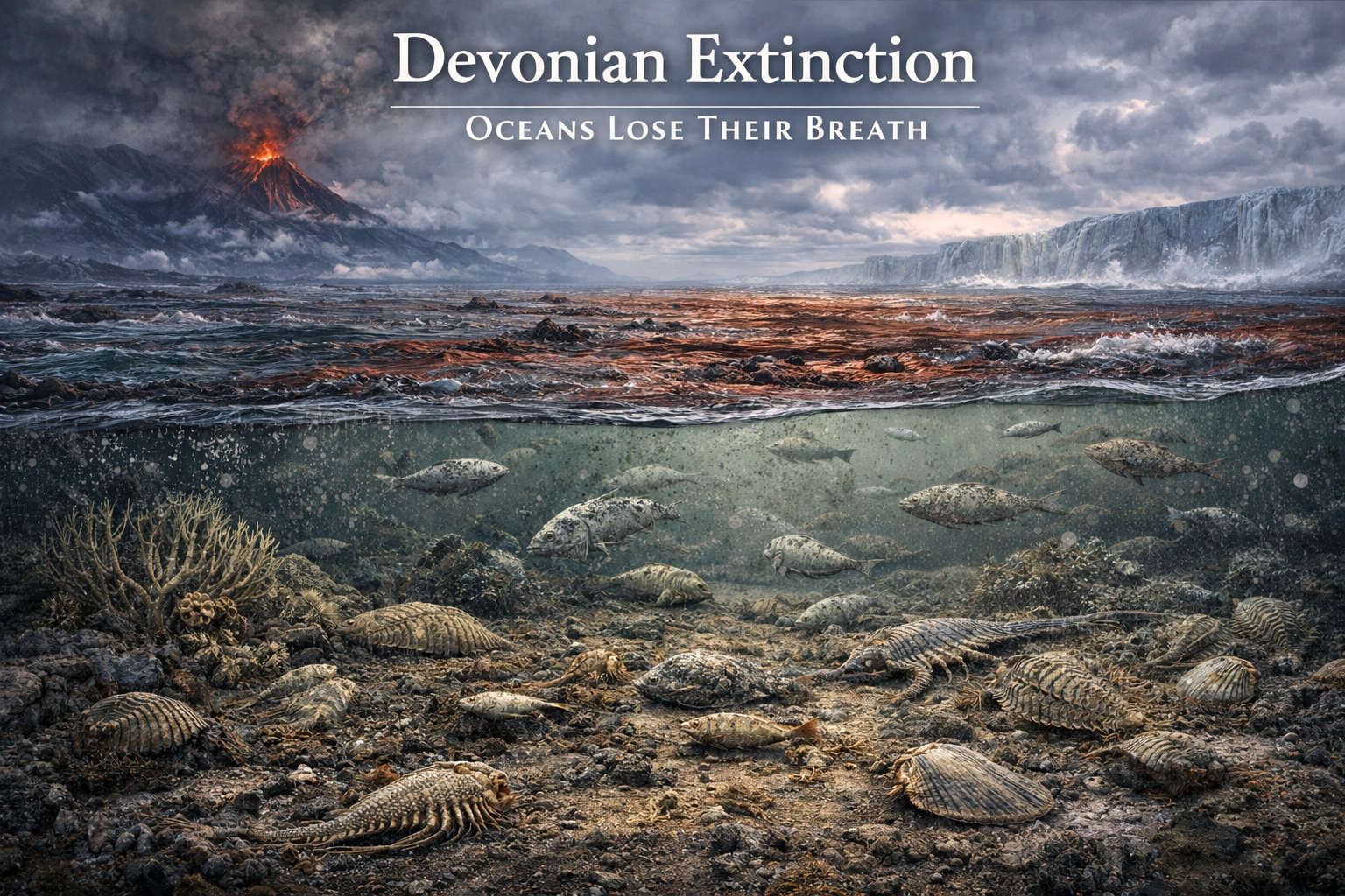The Devonian extinction was not one sudden blow, but a long crisis across millions of years. Many marine species disappeared as oceans became oxygen-poor. The exact cause remains debated, but likely stressors include nutrient runoff, algal blooms, climate shifts, and widespread ocean anoxia.