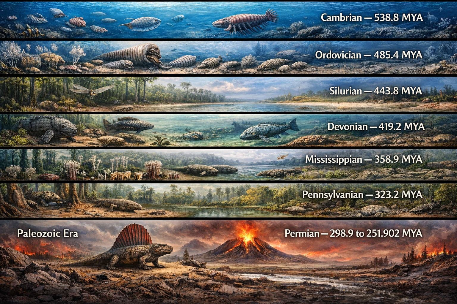 Life during the Paleozoic was, above all, the story of ancient life becoming bold, diverse, and increasingly complex. Early on, the seas dominated the planet, and marine life flourished in astonishing variety during and after the Cambrian explosion. Trilobites, brachiopods, mollusks, reef communities, early fishes, and many other marine forms filled warm shallow seas. Later, the great long-term shift of the era was life’s movement onto land: first plants, then more complex terrestrial ecosystems, then amphibians, and eventually reptiles and synapsids by the late Paleozoic. In many ways, this was the era when Earth first began to look biologically familiar.
