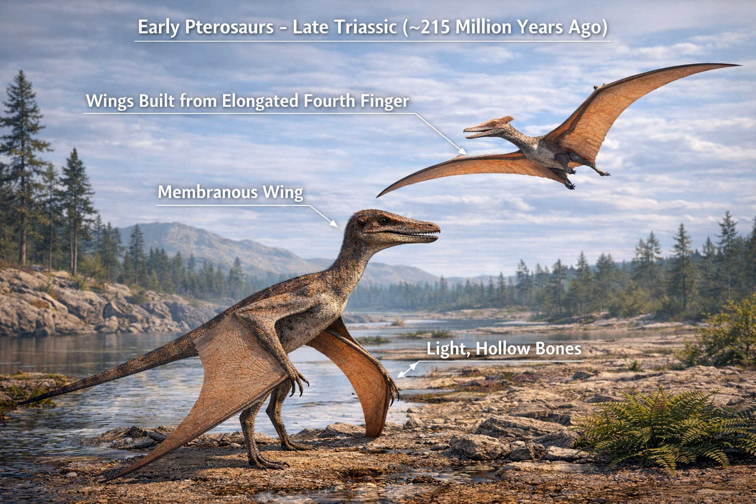 Pterosaurs were the first true flying vertebrates, appearing in the Late Triassic. They were not feathered birds, not bats, and not dinosaurs. They were a distinct branch of flying reptiles with wings formed mainly by a greatly elongated fourth finger supporting a wing membrane. The earliest true pterosaurs already appear as capable fliers, which means their branch had likely been developing for some time before the first clear fossils we have found.